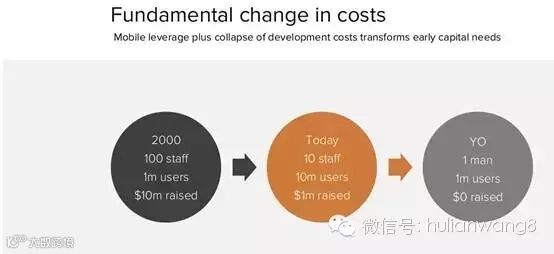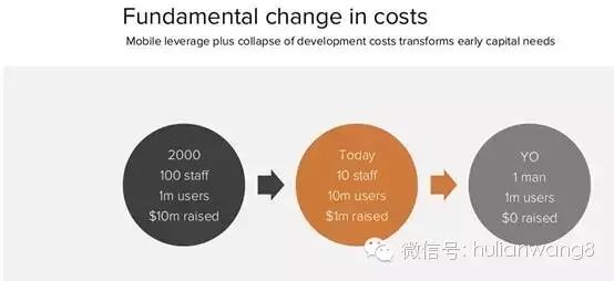 “杠杆效应”还改变了互联网初创企业对早期资本的需求:2000 年,一个融资 1000 万美金、拥有 100 名员工的初创企业能吸引 100 万用户;现在,融资 100 万美元,有 10 个员工的公司就能吸引 1000 万用户;而未来凭借移动互联网,一人白手起家,不要拿什么投资,就能吸引 100 万用户。