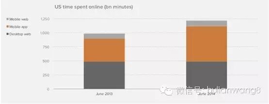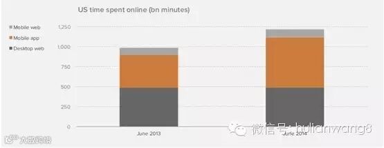 2013年 6 月,用户通过桌面上网时间还多于用户通过手机上网时间;但2014年 6 月,后者(App + 移动浏览器)已明显超过前者。