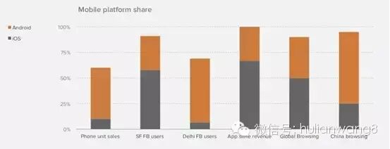 如上图,全球销量看,Android 手机明显多于苹果;但 Facebook 旧金山用户中,苹果设备使用者多于Android,同时在雅加达,情况则反过来;另外,苹果应用商店收入明显高于 Google Play;而以全球浏览器上网数据看,苹果略高于 Android,但中国数据则完全相反,Android 明显多于苹果。