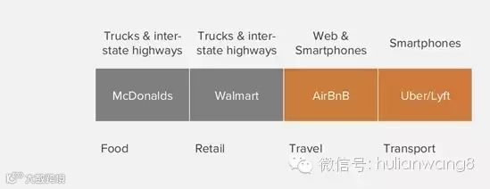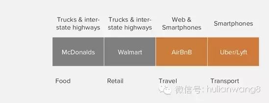 2. 通常跟技术相关公司分三种。一是以技术为核心的公司,如苹果;二是通过技术改进产品或扩展业务,但技术不是核心,如亚马逊;三是被新技术催生出的公司,可能做的是传统行业,但都基于新技术,如 Airbnb。而如果重点关注第三种公司,我们会发现:每波技术创新浪潮,都会催生一些新行业,比如: