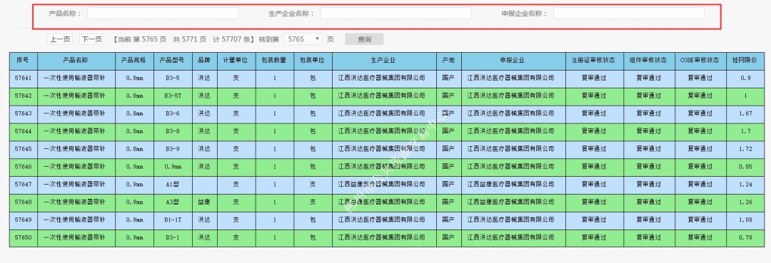 挂网企业信息公示表中,共有大小企业千余家,涉及生产企业、代理企业和配送企业。挂网产品信息公示中,则共有产品57707条,分列信息包括产品名称、生产企业、申报企业等基本信息。最重要的是产品挂网限价,有几毛钱的,有几千元的。(说明:由于产品信息公示共计5765页、57707个产品,这里不一一列出,可登录网站,根据公示页的快捷搜索框查询相关企业和产品信息。)
