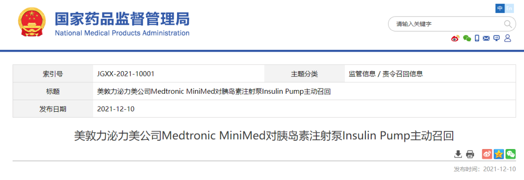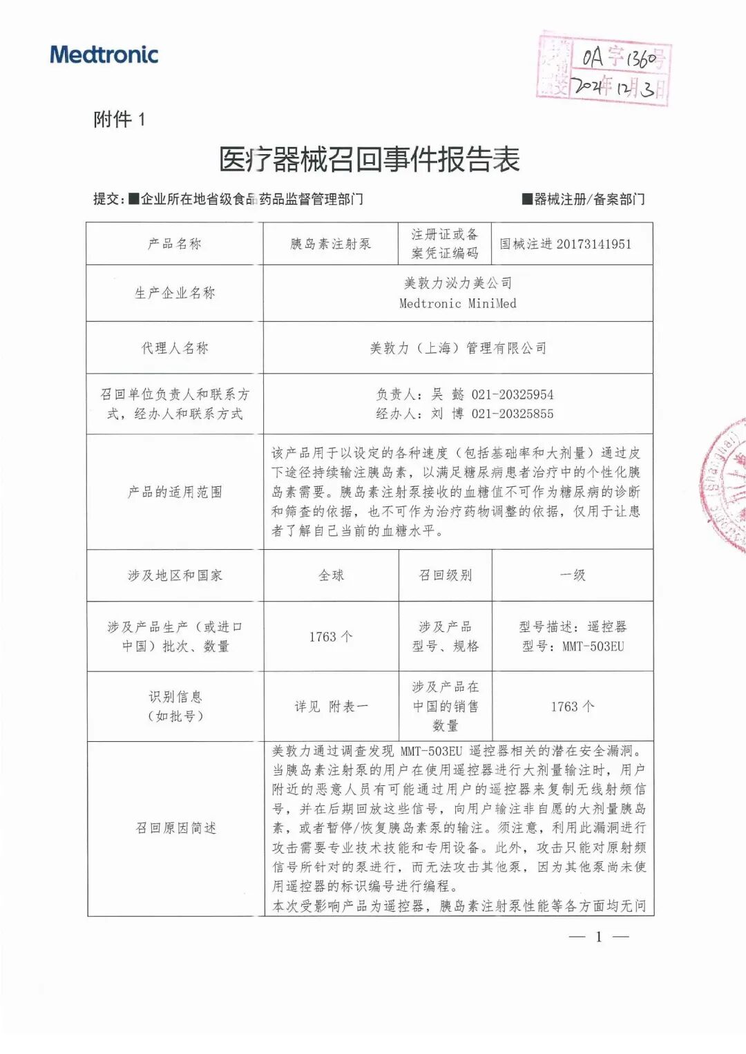 美敦力(上海)管理有限公司报告,由于涉及特定型号、特定批次产品,MMT-503EU遥控器存在潜在安全漏洞的问题。生产商美敦力泌力美公司Medtronic MiniMed对胰岛素注射泵Insulin Pump(注册证号:国械注进20173141951)主动召回。召回级别为一级。涉及产品的型号、规格及批次等详细信息见《医疗器械召回事件报告表》。