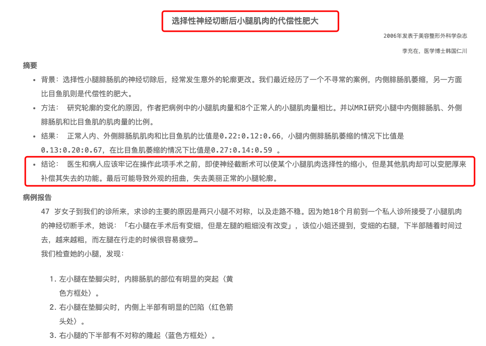 《中国临床解剖学杂志》也有专业论文提示,小腿肌肉阻断术的并发症包括:误切除比目鱼肌神经肌支或皮神经,造成小腿功能障碍及局部的皮肤感觉障碍;切口瘢痕增生及色素沉着;双腿大小及外观不对称等。