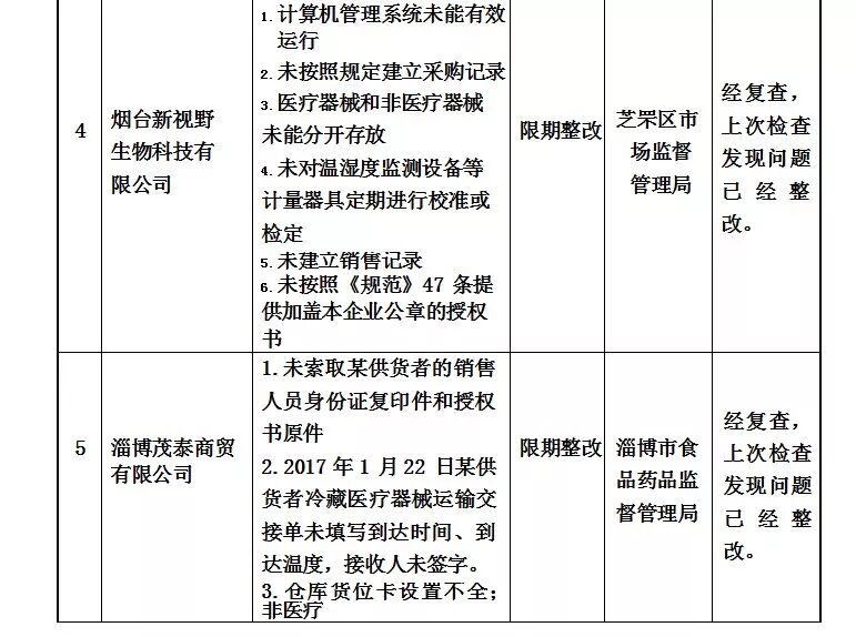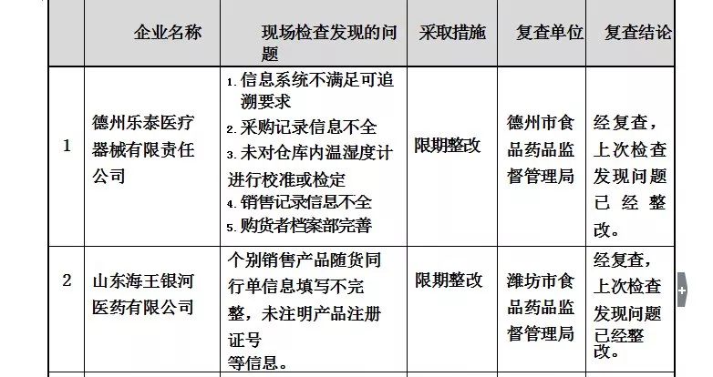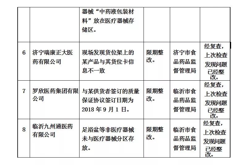 检测发现,德州乐泰医疗器械有限责任公司、山东海王银河医药有限公司、山东康源生物技术有限公司、烟台新视野生物科技有限公司、淄博茂泰商贸有限公司、济宁瑞康正大医药有限公司、罗欣医药集团有限公司、临沂九州通医药有限公司8家医疗器械经营企业存在部分缺陷项目。