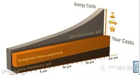 光伏租赁业务是SolarCity的独创业务,主要应用在SolarCity的居民项目中。该业务与美国净计量电价(Net Metering)政策紧密相连。在光伏租赁模式下,SolarCity与居民用户签订20年协议,为居民用户建设及维护屋顶光伏系统,和提供发电服务;SolarCity对发电量作出保证,若未达到发电量,SolarCity需补偿。电表采用净计量电表,居民用户只需支付净额用电量的电费。用电量超过发电量时,居民用户向电力公司购买相应电力;发电量超过用电量时,居民用户则会得到一个基于零售价格的信用额度(可在下期使用)。在使用SolarCity的光伏系统后,居民用户大幅节省电费,并从每月节省下来的电费拿出一部分支付给SolarCity作为光伏租赁费(租率根据是否提交少量安装费而定)。使用光伏系统后的净额用电量电费加上光伏租赁费,还少于之前的电费。见图1。对居民用户来说,每月提交的电费减少了,又能用上绿色电力,何乐而不为?故这种免去大笔初装费用又能(实质上)享受低价绿色电力的做法大受居民用户欢迎。