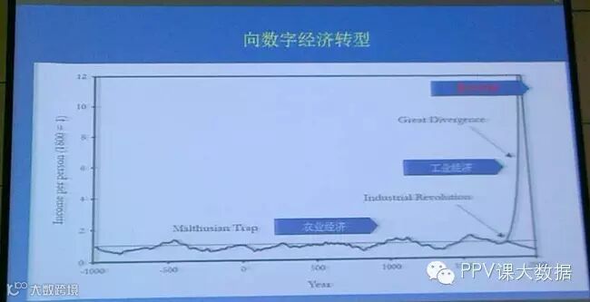 刘东博士认为人类社会经历了从农业经济到工业经济,到即将到来或者已经在摸索前进的数字经济转型。且由图所示,可以看出三个阶段发展的时间和速度,农业经济到工业经济,发展将近用了2000年时间,而工业经济进展到数字化经济才200多年,且互联网之后,移动互联网的迅速发展,使得数据积累越来越多,大数据的发展和应用也越来越广。