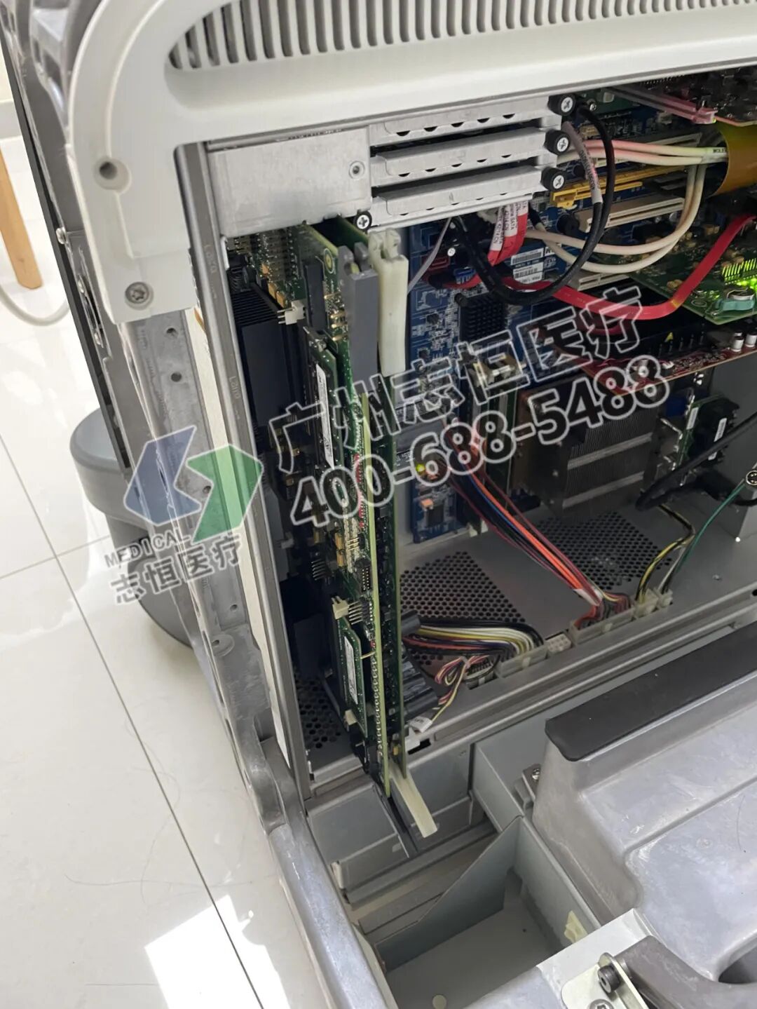 3、将ACB板和PRB板重新安装后,机器正常启动显示并进入超声界面,推测机器原来ACB板和PRB板可能存在拔插问题。机器正常启动后发现所有探头图像均在相同位置存在亮道,判断为机器前端发射接收部分存在故障。