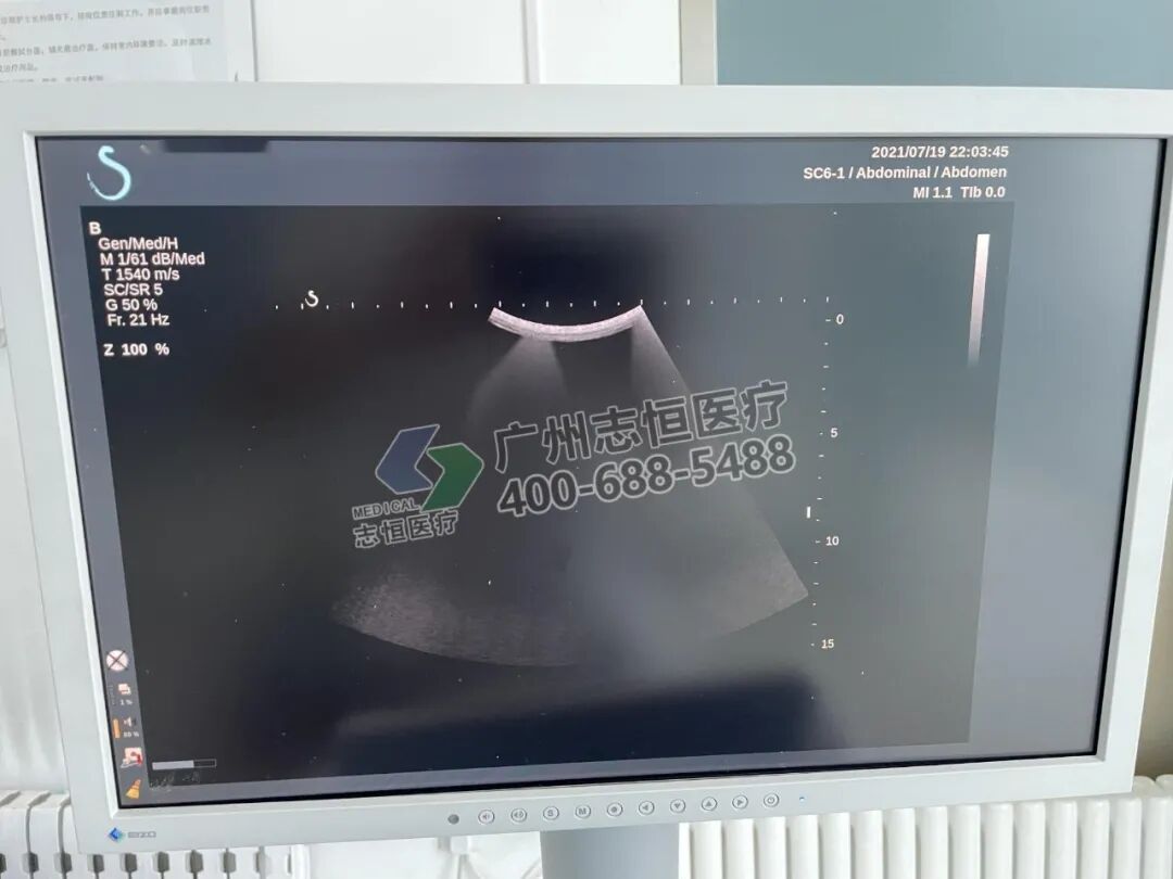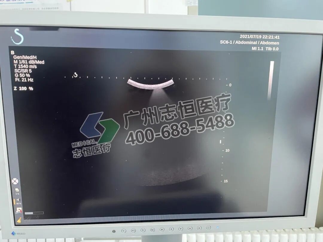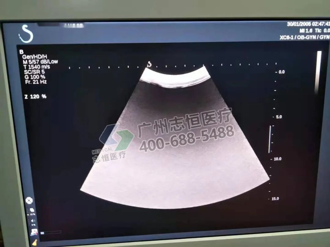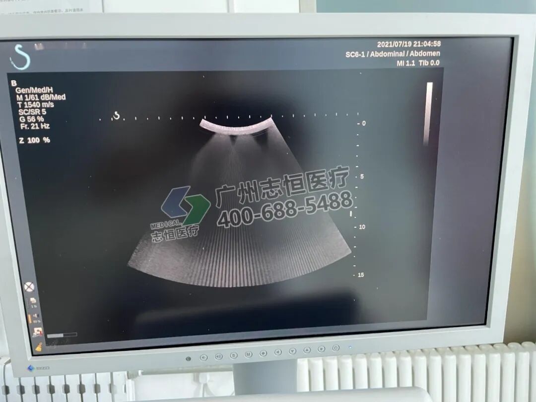 声科 Aixplorer 机器开机正常进入超声界面,腹部探头图像存在多个亮道伪影。