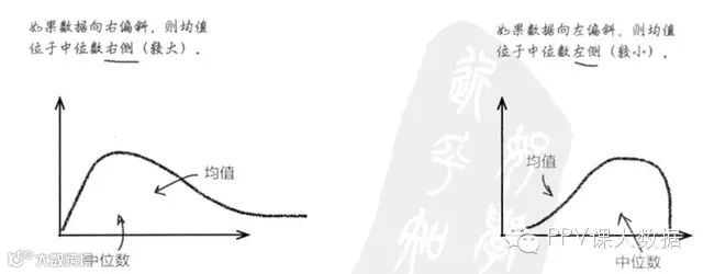 右偏,均值被拉高,从而均值大于中位数;左偏,均值被拉低,从而均值小于中位数;对称,均值等于中位数。