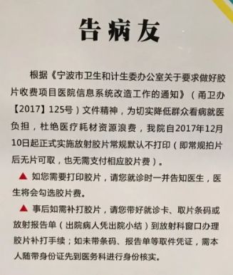 北仑区人民医院实施新政的第一天,急诊科开具的X光、CT检查单为80个,其中真正缴费补打胶片的病人为个位数。