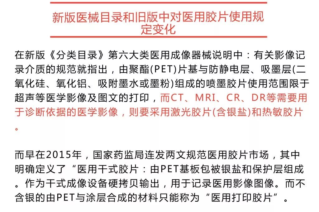 相比2015年的规定,新版《分类目录》更加清晰、严格,CT、核磁,普通X光影像CR、DR的影像记录也排除了医用打印胶片,也就是说,新规从根本上界定了医用打印胶片不能用于诊断及在医患纠纷中的作为医疗影像记录证据。