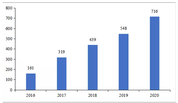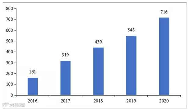 在产品注册上,近年来,全国医用软件注册数量逐年增长。截至2020年底,全国有效的医用软件注册产品总数由2016年的161件到2020年的716件,复合增长率达45.2%,其中,2020年医用软件注册数量相较2019年增长了30.7%。