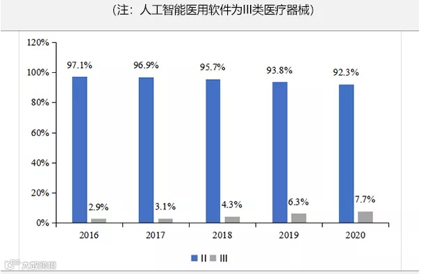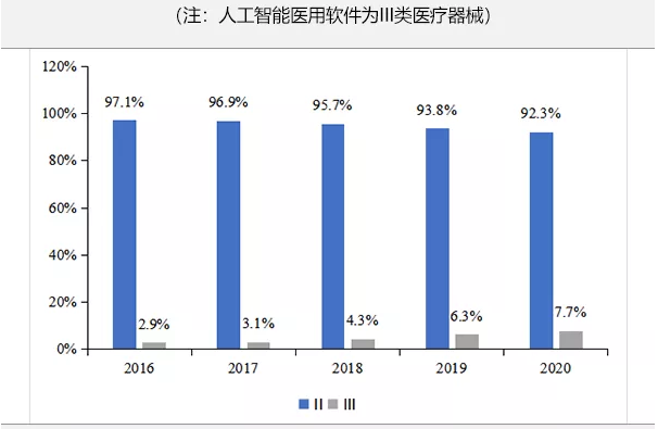 从医用软件管理类别对比看,已注册的软件产品中,II类产品682件,占比95%;III类产品34件,占比5%。从时间维度对比,III类软件的占比从2016年占比2.9%到2020年占比7.7%,呈逐年递增的趋势,II类软件比例逐年下降。