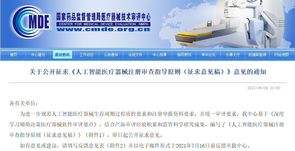 6月4日,国家药监局器审中心发布了关于公开征求《人工智能医疗器械注册审查指导原则(征求意见稿)》意见的通知。