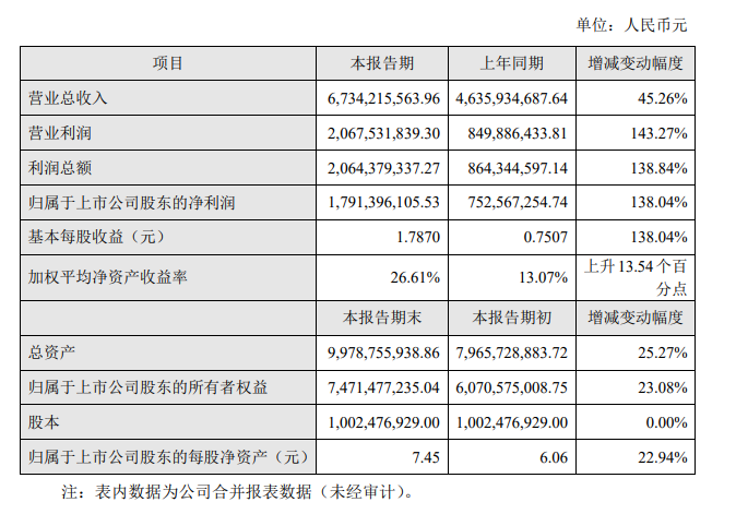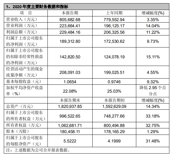 报告期内,公司实现营业收入 805682.68万元,较上年同期增长 3.35%;营业利润223664.41万元,较上年同期增长14.04%;利润总额 229484.16 万元,较上年同期增长11.22%。