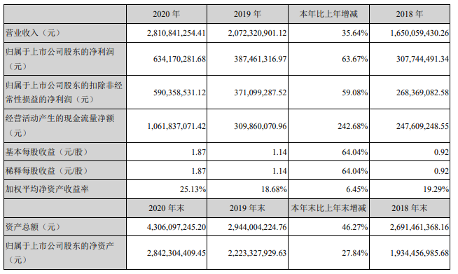 2020年,万孚生物营业收入为2810841254.41元,同比增长35.64%;净利润达634170281.68元,同比增长了63.67.
