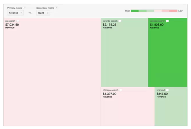 回到刚才说的150,000行有代表性的关键词,这些词都是你在一场复杂的搜索引擎营销策略里投下的。如果能快速地将其按层级(比如campaign)分组,并在如下图所示的一个树状图里将其可视化,那么它会很快地告诉你:1)你的收入从哪来(最大的部分) 2)你最大的利润从哪来(最绿的部分)