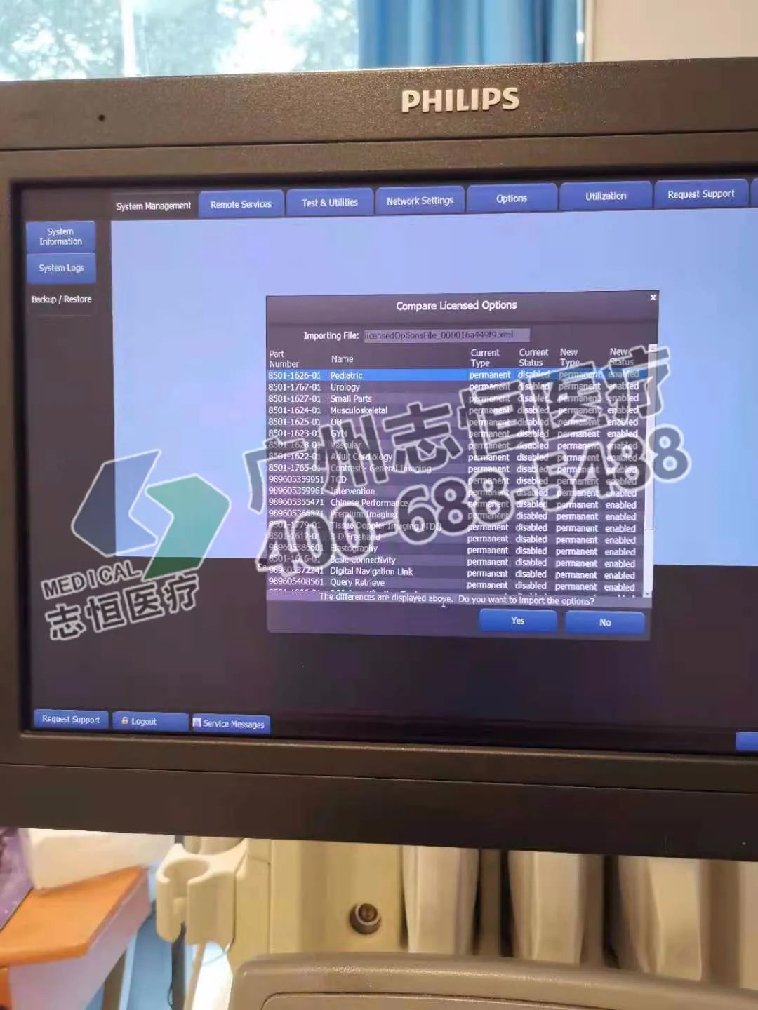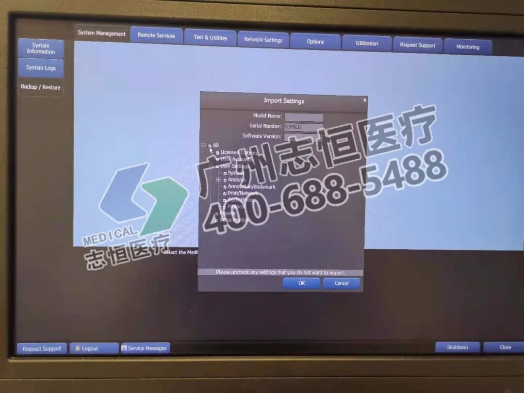 10.机器开启后,会弹出安装license,把带有license文件的U盘插入机器的USB接口,进入机器后台,在System Management页面选择Backup/Restore选项,设备选择U盘,然后点击Restore还原license,系统会自动识别U盘上的license文件,然后在弹出的Compare Licensed Options对话框中选“yes”,页面弹出Import Settings对话框,其中可以看到序列号以及需要还原的各种文件信息,选择ALL,点击OK,直到license安装完成,机器重启。