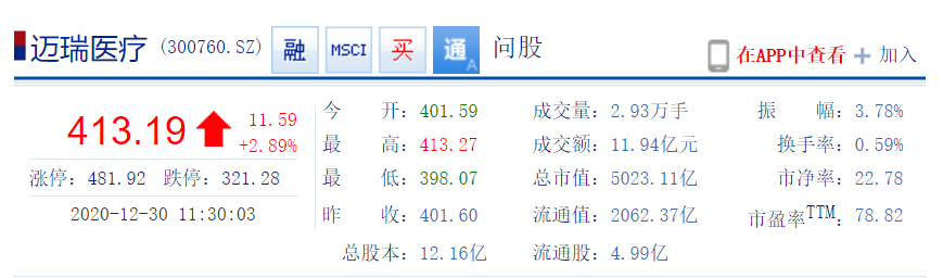 2020年12月30日,迈瑞医疗没有把悬念带到2021年,当日收盘价413元,市值突破5000亿大关!同比去年,迈瑞股价180元,市值2000亿左右,仅仅用了一年时间,迈瑞医疗可谓脱胎换骨。