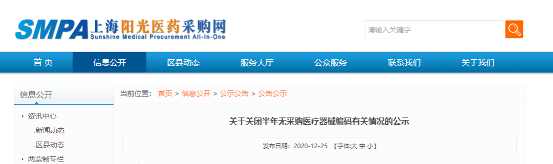 2020年12月25日,上海阳光医药采购网最新发布了一则《关于关闭半年无采购医疗器械编码有关情况的公示》(以下简称《公示》)。