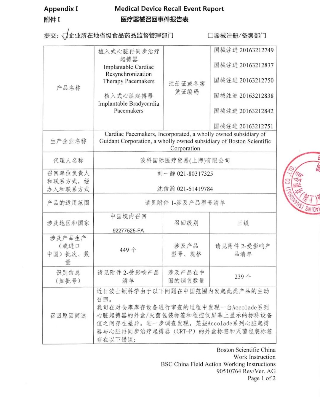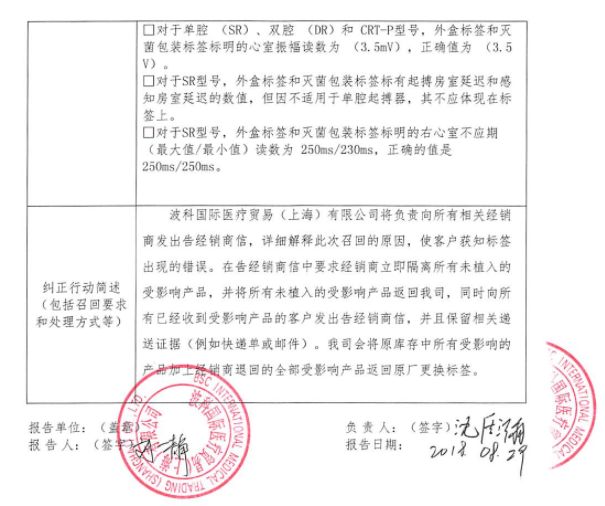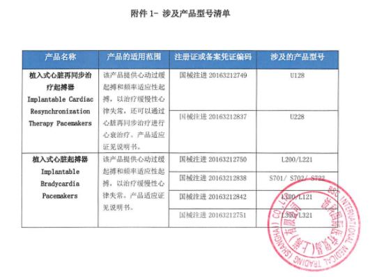 波科国际医疗贸易(上海)有限公司对植入式心脏再同步治疗起搏器、植入式心脏起搏器主动召回