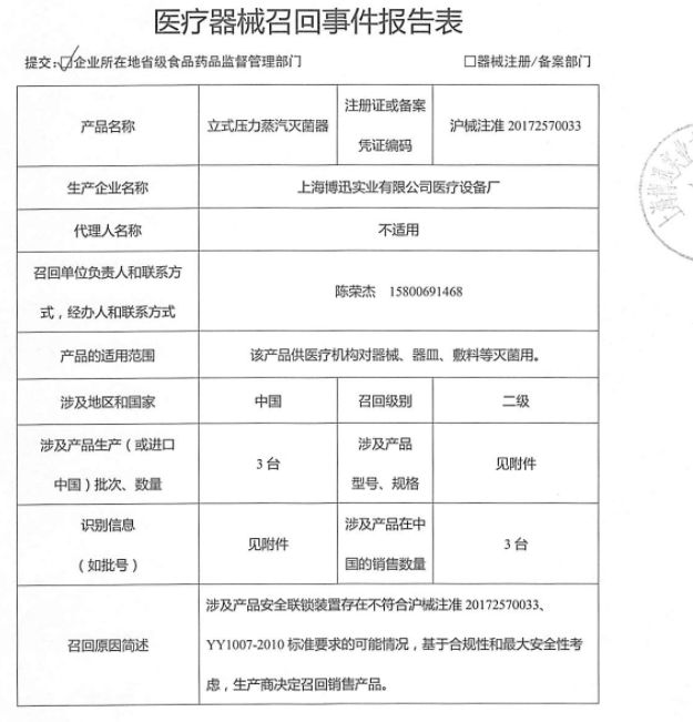 上海博讯实业有限公司医疗设备对立式压力蒸汽灭菌器主动召回