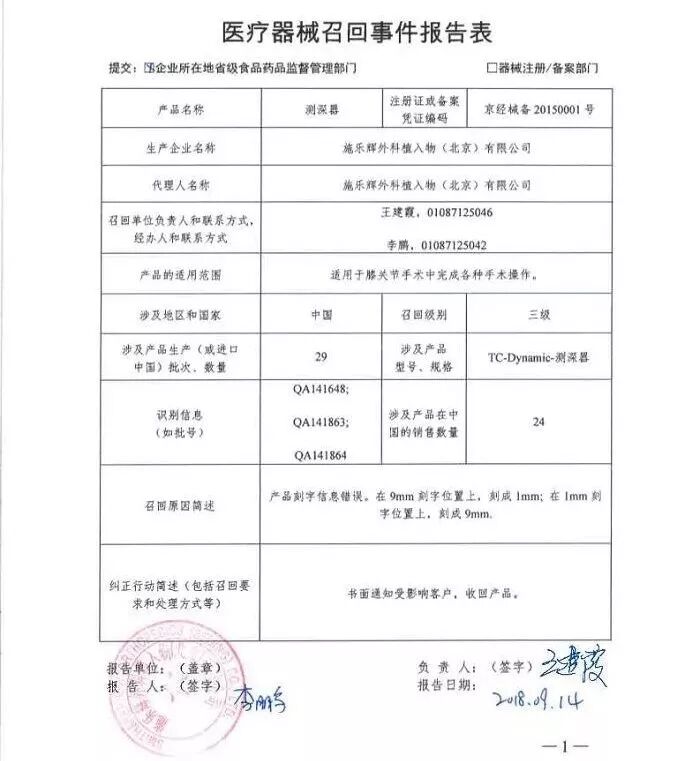 施乐辉外科植入物(北京)有限公司对测深器主动召回