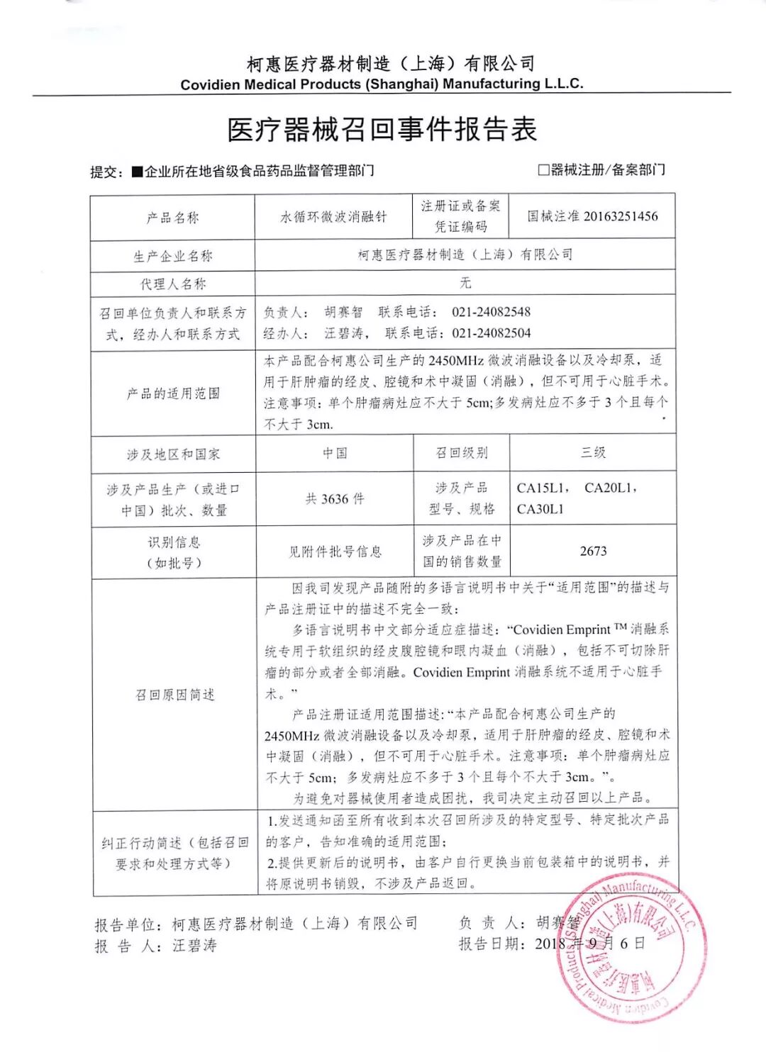 柯惠医疗器材制造(上海)有限公司对水循环微波消融针主动召回