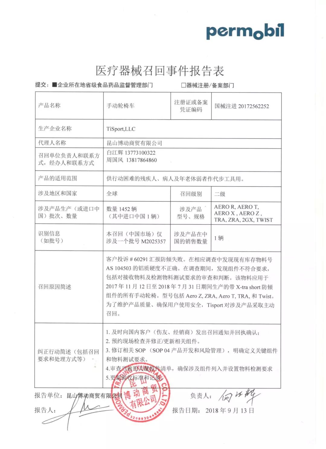 昆山博动商贸有限公司对手动轮椅车主动召回