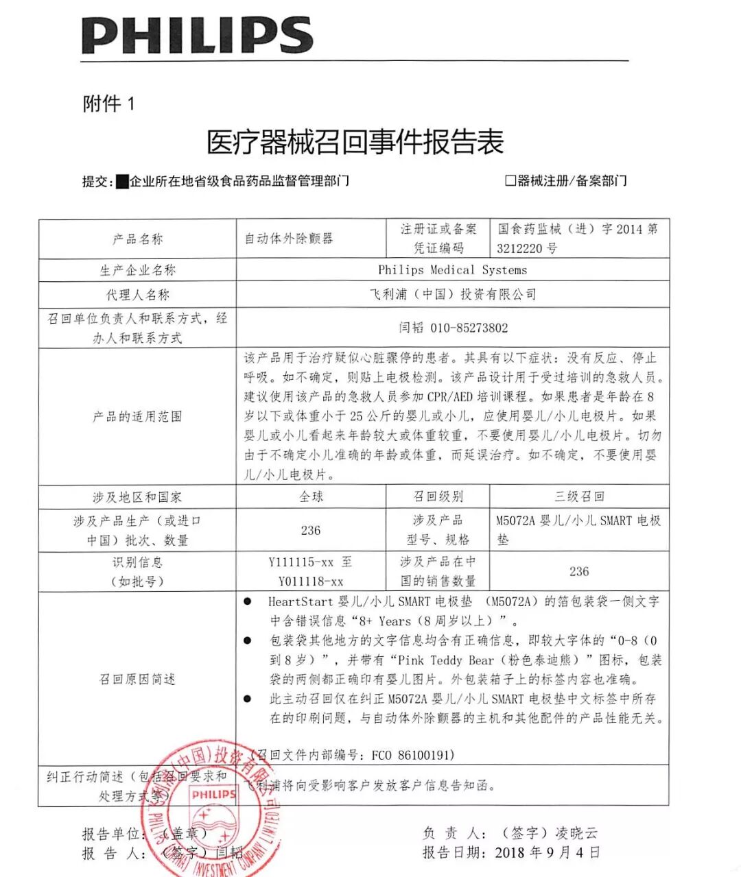 飞利浦(中国)投资有限公司对自动体外除颤器主动召回