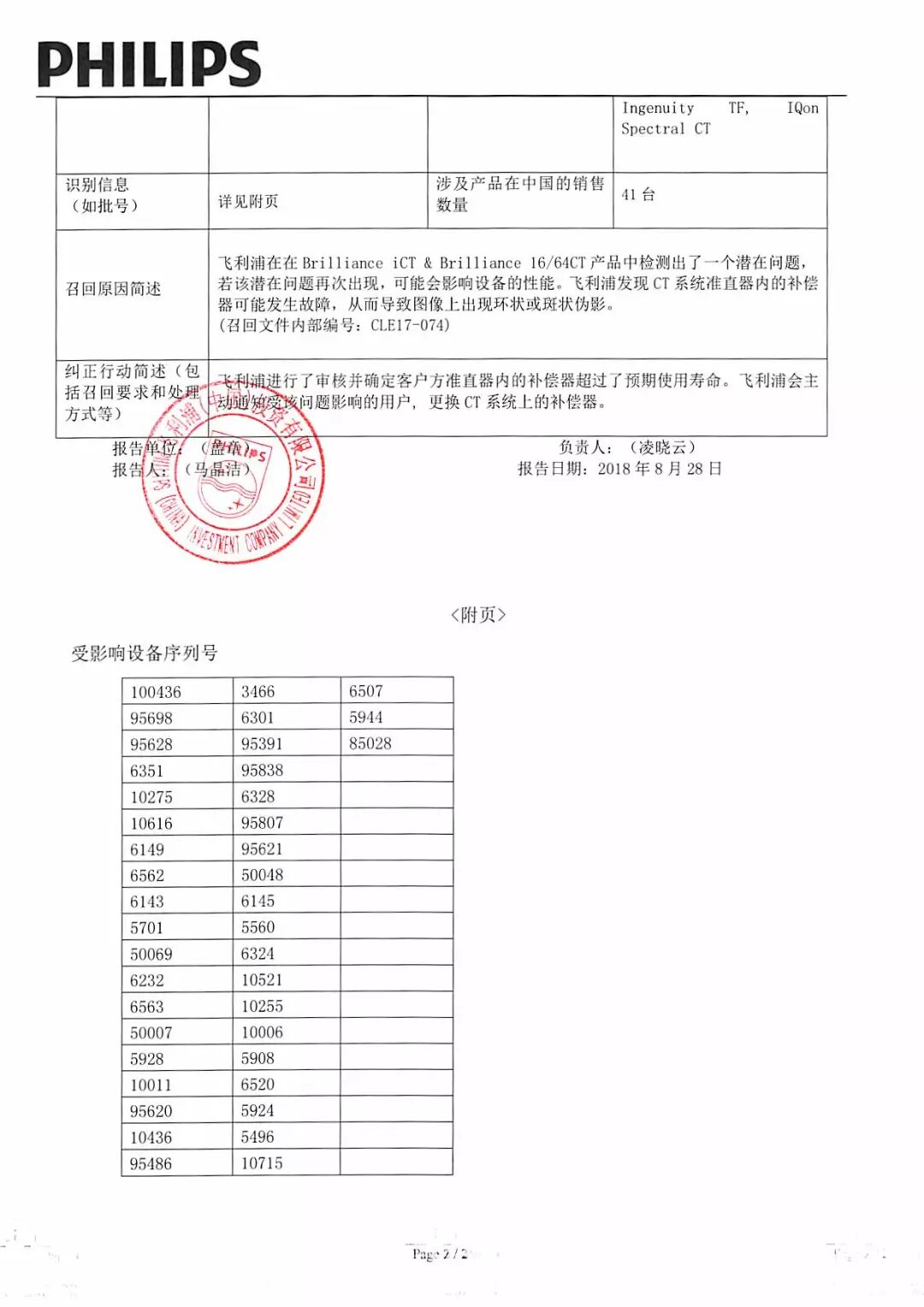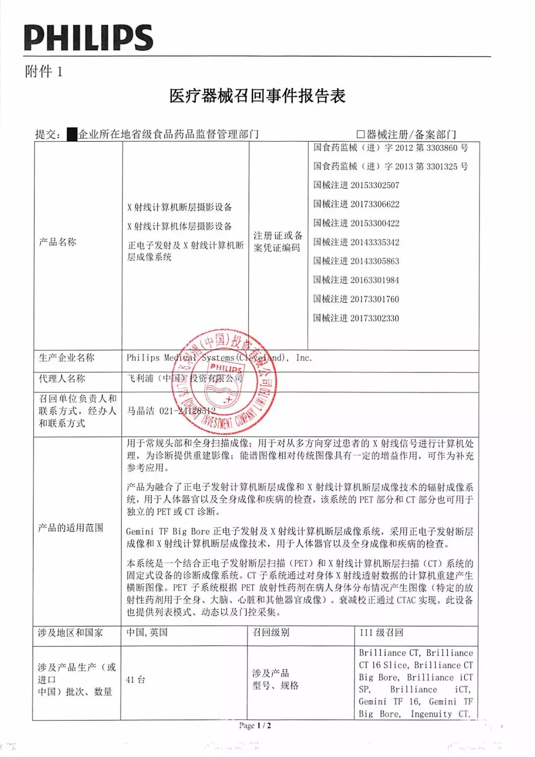 飞利浦(中国)投资有限公司对X射线计算机断层摄影系统等产品主动召回