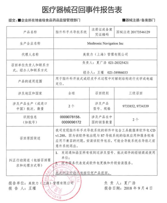美敦力(上海)管理有限公司对脑外科手术导航系统主动召回