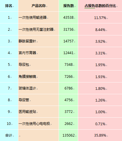 2017年,全国上报的医疗器械不良事件报告中,报告数量排名前十位的无源医疗器械分别为一次性使用输液器、一次性使用无菌注射器、静脉留置针、宫内节育器、导尿包、角膜接触镜、玻璃体温计、导尿管、医用输液贴和一次性使用心电电极,占总报告数的35.89%。