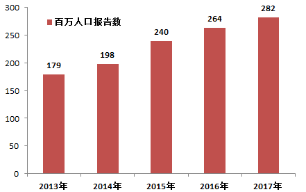 2017年,我国每百万人口平均医疗器械不良事件报告数为282份,与2016年相比增长了18份。
