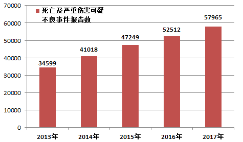 2013-2017年全国死亡及严重伤害可疑不良事件报告数比较