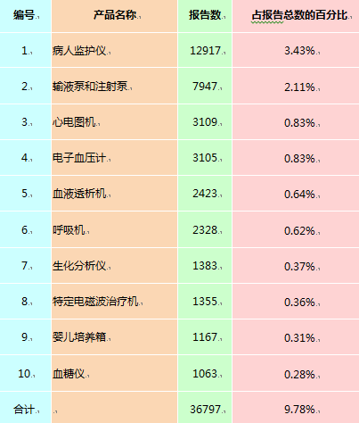 2017年,全国上报的医疗器械不良事件报告中,报告数量排名前十位的有源医疗器械分别为病人监护仪、输液泵和注射泵、心电图机、电子血压计、血液透析机、呼吸机、生化分析仪、特定电磁波治疗机、婴儿培养箱、血糖仪,占总报告数的9.78%。