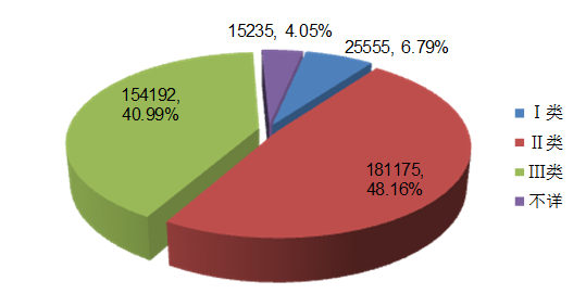 2017年,全国上报的医疗器械不良事件报告中,涉及Ⅲ类医疗器械的报告154192份,占总报告数的40.99%;涉及Ⅱ类医疗器械的报告181175份,占总报告数的48.16%;涉及Ⅰ类医疗器械的报告25555份,占总报告数的6.79%;部分报告涉及的器械管理类别不详,共15235份,占总报告数的4.05%。数据显示,涉及Ⅲ类和Ⅱ类医疗器械的报告占绝大多数,这与医疗器械风险程度高低相吻合。