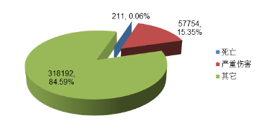 2017年,全国上报的医疗器械不良事件报告中,事件伤害为死亡的报告共211份,占总报告数的0.06%;事件为严重伤害的报告共57754份,占总报告数的15.35%;事件伤害为其他的报告共318192份,占总报告数的84.59%。2017年,各类伤害程度的报告所占比例与2016年基本一致。