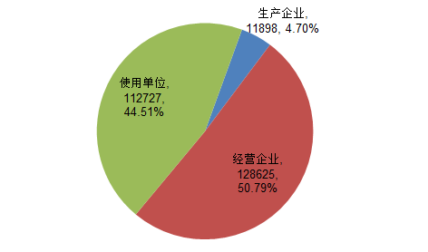 截至2017年12月31日,在“全国医疗器械不良事件监测系统”中注册的基层用户(包括医疗器械生产企业、经营企业和使用单位)共253250家。其中,医疗器械生产企业11898家,占注册基层用户总数的4.70%;经营企业128625家,占注册基层用户的50.79%;使用单位112,727家,占注册基层用户的44.51%。