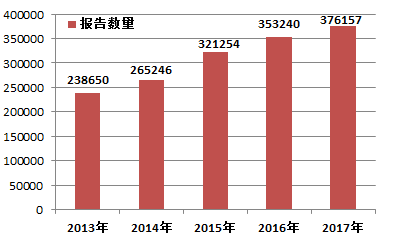 2017年,国家药品不良反应监测中心共收到《医疗器械不良事件报告表》376157份,比2016年增长了6.49%。