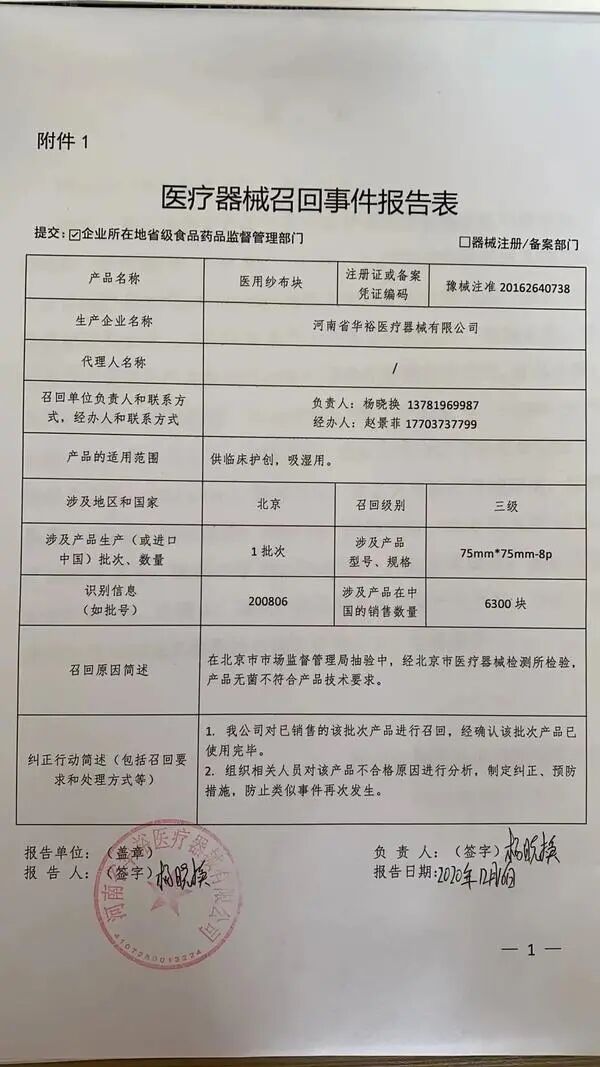河南省华裕医疗器械有限公司报告,由于其生产的一批次医用纱布块无菌项不符合规定,企业对其主动召回,召回级别为三级。