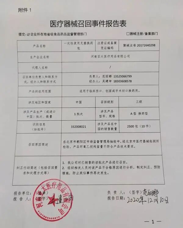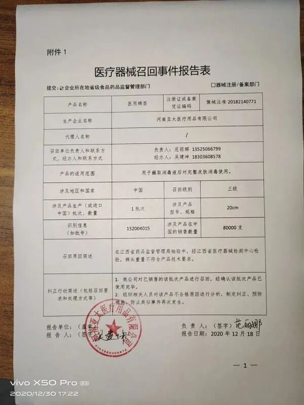 河南亚太医疗用品有限公司报告,由于其生产的一批次医用棉签棉头重量不符合规定,一批次一次性使用无菌换药包环氧乙烷残留不符合规定,企业对其主动召回,召回级别为三级。