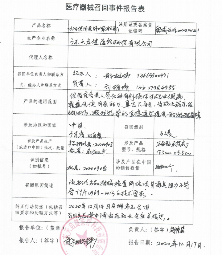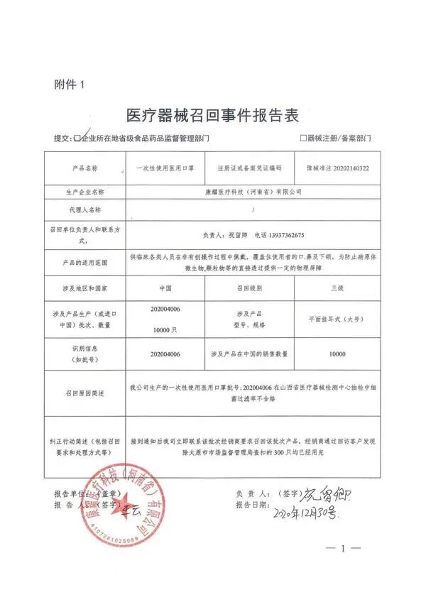 康耀医疗科技(河南省)有限公司报告,由于其生产的一批次一次性使用医用口罩细菌过滤效率不符合规定,企业对其主动召回,召回级别为三级。