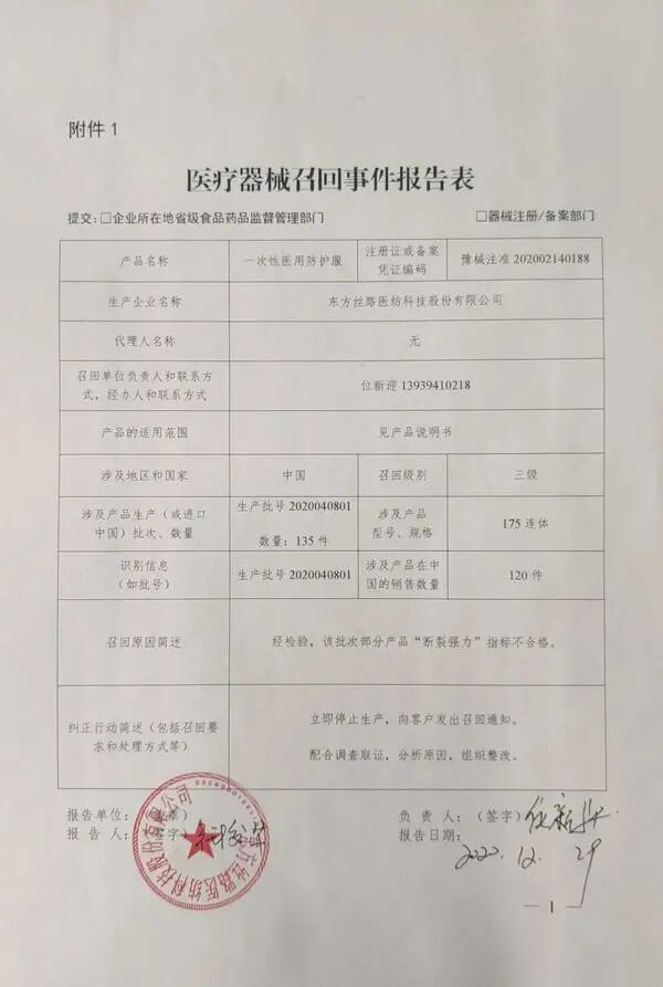 东方丝路医纺科技股份有限公司报告,由于其生产的一批次一次性医用防护服断裂强力不符合规定,企业对其主动召回,召回级别为三级。