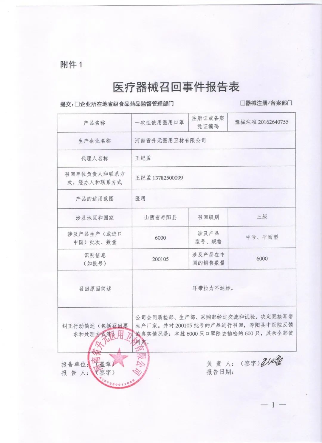 河南省升元医用卫材有限公司报告,由于其生产的一批次一次性使用医用口罩,口罩带拉力不符合规定,企业对其主动召回,召回级别为三级。