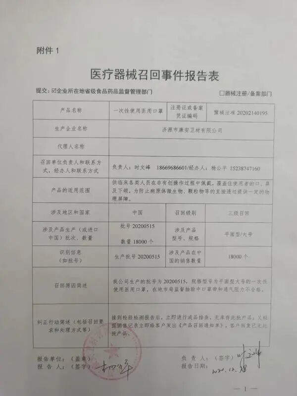 济源市康安卫材有限公司报告,由于其生产的一批次一次性使用医用口罩口罩带和通气阻力不符合规定,企业对其主动召回,召回级别为三级。