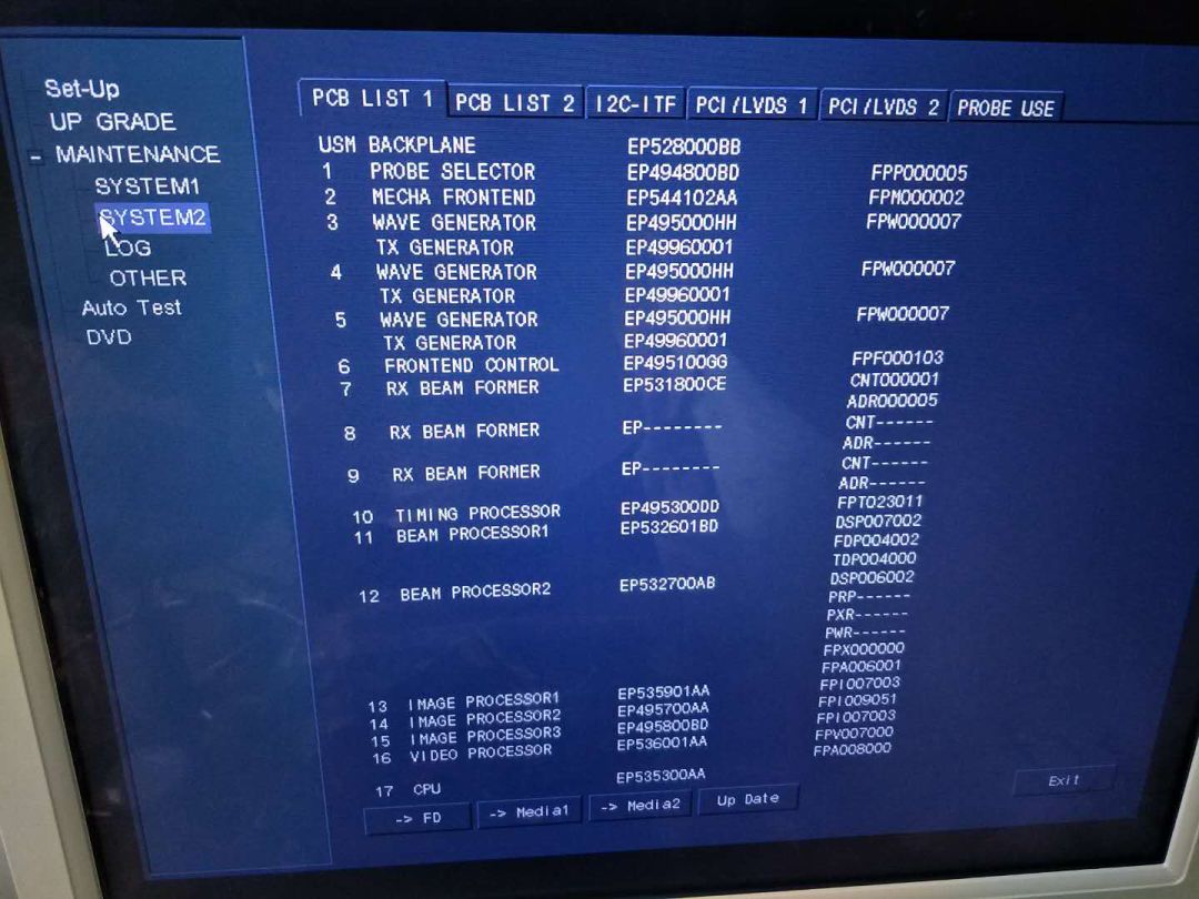 由上图板块名字可判断EP495000为波束形成板,每块EP495000上均有4块EP499600负责发射功能,而EP531800则负责超声回波接收功能,在更换另一块EP531800后图像亮道消失,确定为该板故障。