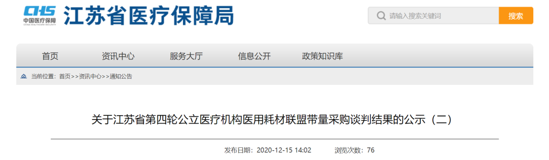 12月15日,江苏省医保局发布《关于江苏省第四轮公立医疗机构医用耗材联盟带量采购谈判结果的公示(二)》。