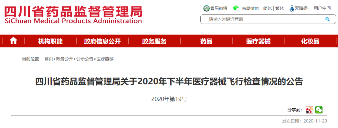 无独有偶,就在此前11月下旬,四川省药监局也发布了《关于2020年下半年医疗器械飞行检查情况的公告》(以下简称《公告》)。