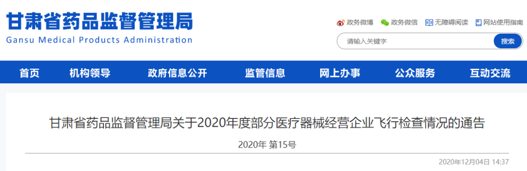 12月4日,甘肃省药监局最新发布了一则《关于2020年度部分医疗器械经营企业飞行检查情况的通告》(以下简称《通告》)。